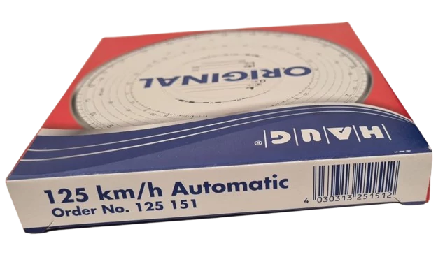 Magas minőségű HAUG 125 km/h méréshatárú tachográf korong. Automatikus kiértékeléshez Méréstartomány: 20 km/h - 125 km/h EK jóváhagyási szám: e13 21
